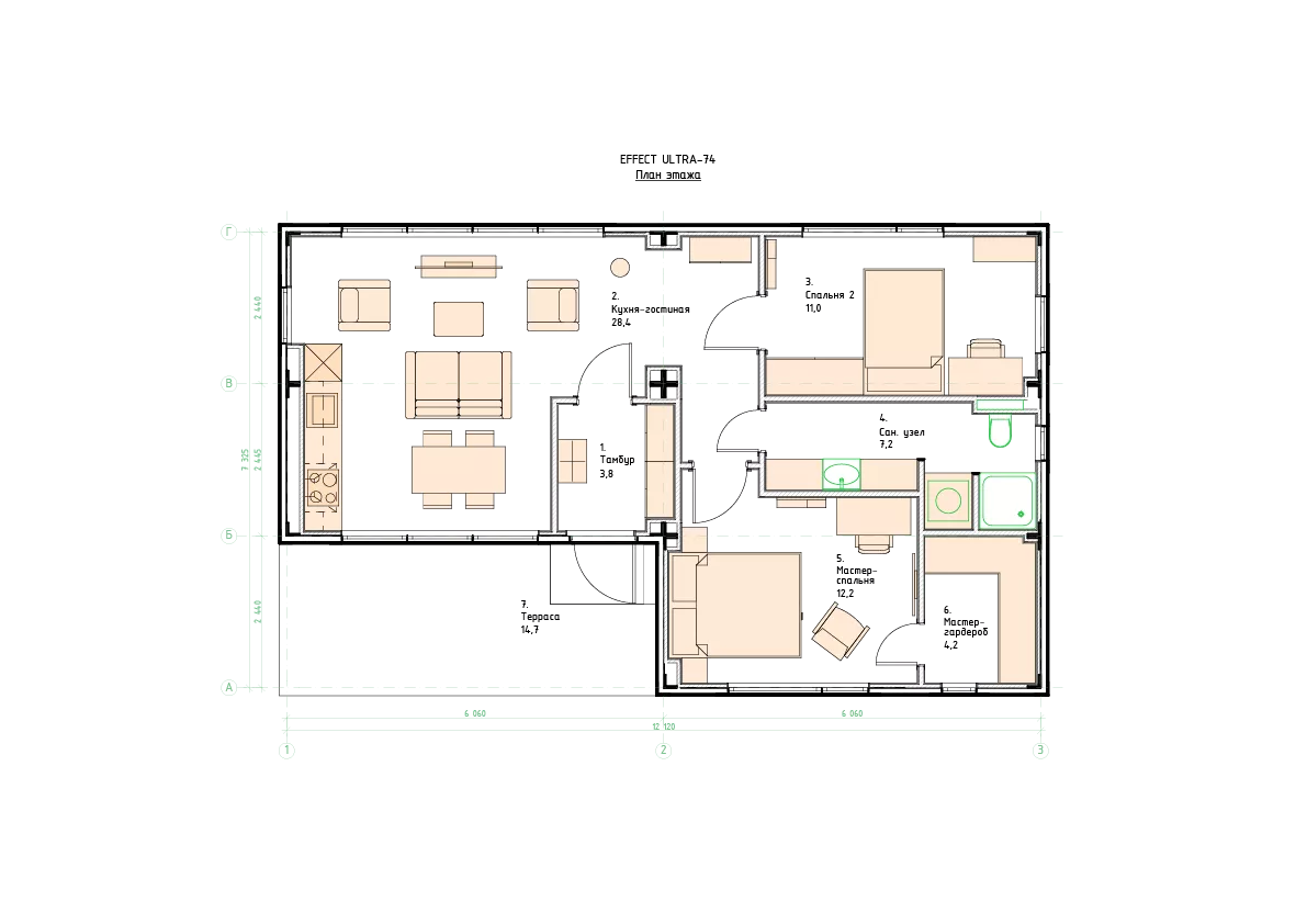 Модель "ULTRA 74" представляет одноэтажный дом современного дизайна общей площадью 74 квадратных метров. Этот компактный и экономичный вариант отлично подходит для маленькой семьи или пары, ищущей уютное и функциональное жилище.